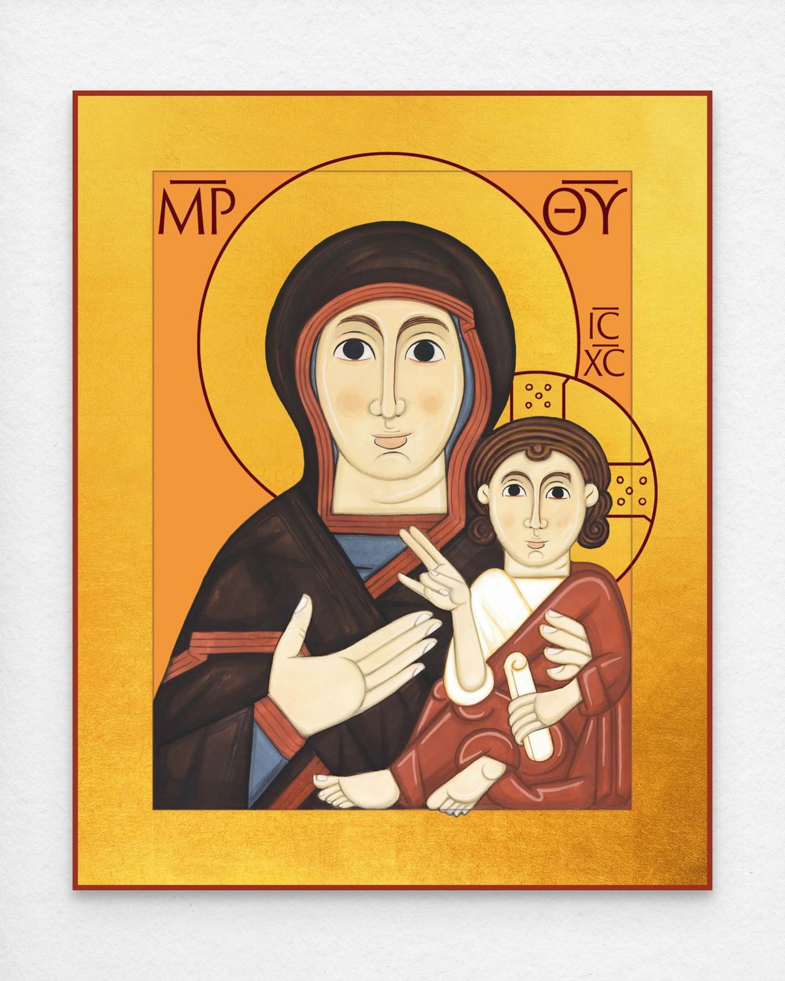 Reproductions from the studio begin with the same printing process as the paper prints, using the highest quality processes to create fine-art prints of unparalleled quality. Once ready, these are permanently affixed either to wooden panels, in the case of smaller reproductions, or to cradled Baltic plywood panels, in the case of larger reproductions. Then the halo and frame of each is gilded with pure gold, to add something of the beautiful heavenly light to the work. Finally, they are edged and vanished to ensure their durability for years to come.